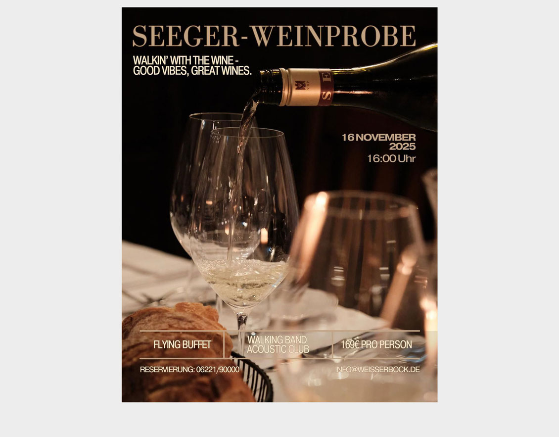 Begleitet werden die Gänge von einer erlesenen Auswahl an Seeger-Weinen, die perfekt auf das Menü abgestimmt sind. So entsteht ein harmonisches Zusammenspiel aus feiner Küche und großen Weinen, das den Abend unvergesslich macht. Für die musikalische Stimmung sorgt die Walkin' Band, die das Motto „Walkin' with the Wine – not in the sunshine“ lebendig werden lässt und mit ihrem Sound die ideale Begleitung zum Genusserlebnis bietet.